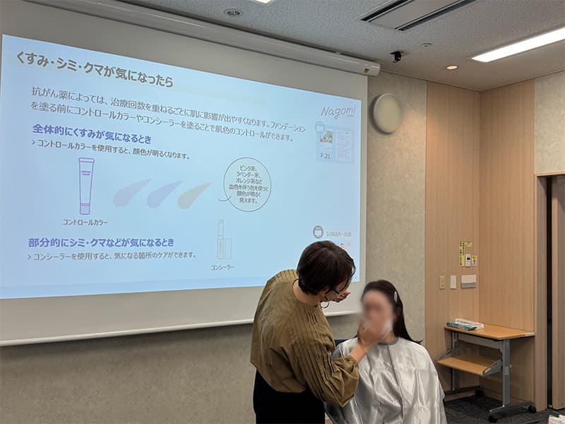 ご参加いただいた患者さんに、治療中の外見の変化のお悩みで多い肌のカラー補正、シミ・くすみのカバー、目元のメイクやまゆ毛の描き方、スキンケアの方法などをテーマに取り上げイベントを実施しました。講師には、一般社団法人ピアリング アピアランスケア アドバイザー 野村奈美さんをお招きし、実際のケア方法についてレクチャーをいただいた後、参加者みんなで実際のケア方法について体験をしていただきました。