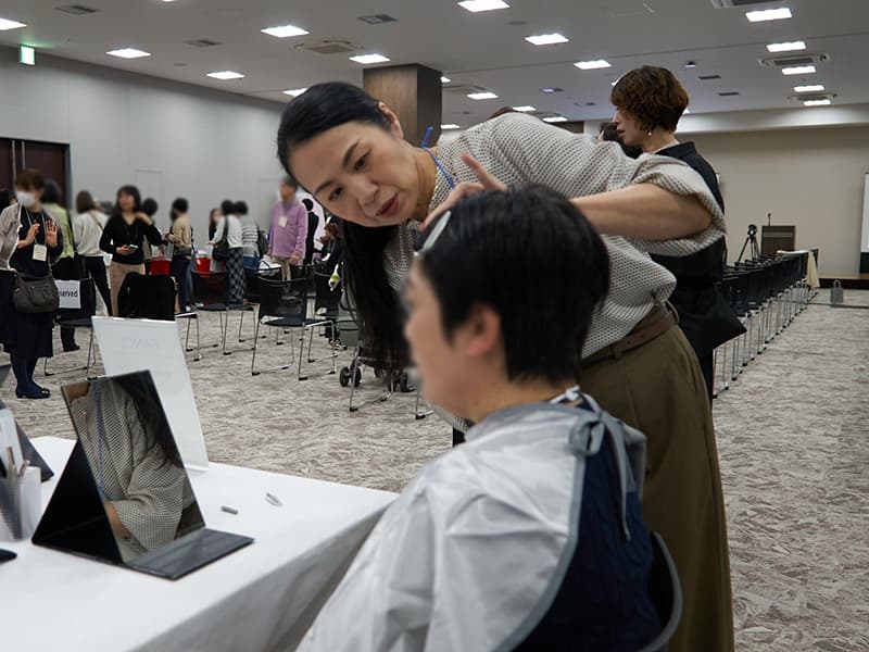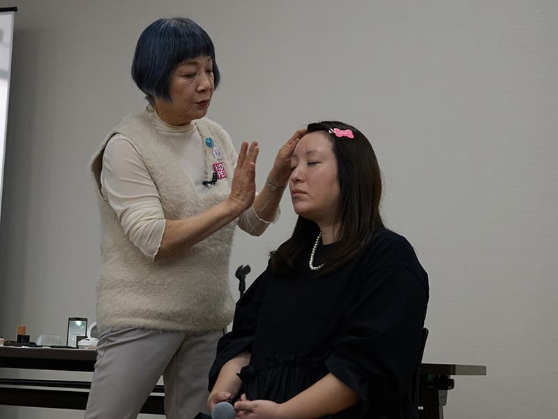 ステージでは、美容ジャーナリストの山崎多賀子さんによる「元気に見えるメイク」の実演が行われました(写真左)。認定NPO法人マギーズ東京 共同代表理事の鈴木美穂さんをモデルに、短時間で印象を明るく見せるメイクのポイントを紹介。山崎さんが実演しながらコツを解説すると、参加者は熱心にメモを取ったり頷いたりしながら耳を傾け、日常生活でもすぐに取り入れられる実践的なテクニックに関心を寄せていました。
