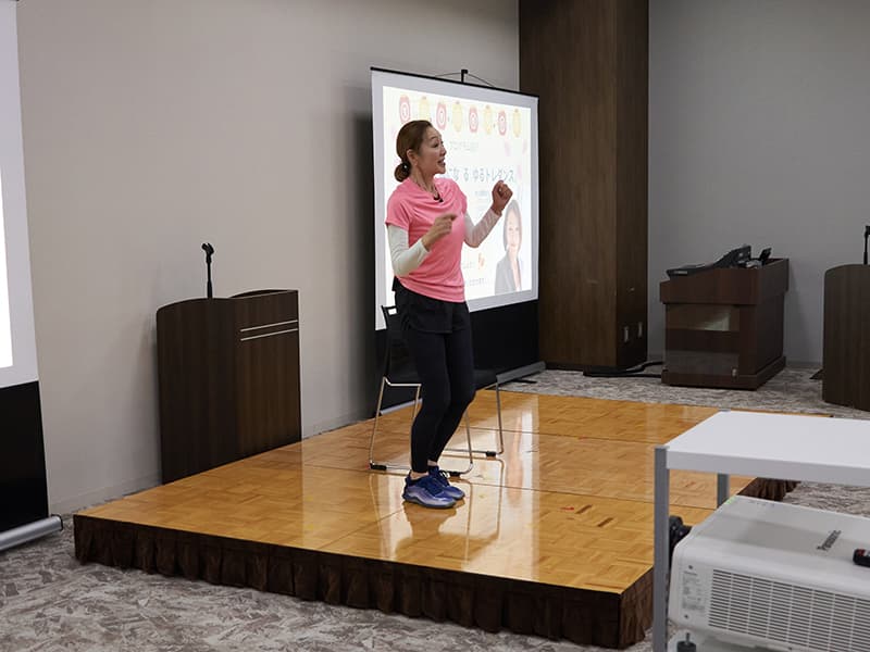 続いて、がん専門運動指導士の村上理香さんによる「ゆるトレダンス」を実施(写真右)。音楽に合わせて誰でも無理なく体を動かせるプログラムで、参加者もその場で一緒に体を動かしながら楽しみ、会場には自然と笑顔が広がりました。体を動かすことで緊張もほぐれ、会場全体が一体となった温かな雰囲気に包まれました。